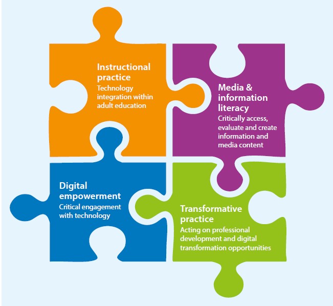 The Framework main objective is to support the development of initiatives for adult educators to empower them and to enhance their digital competence across for core domains: instructional practice, digital empowerment, media and information literacy, and transformative practice.